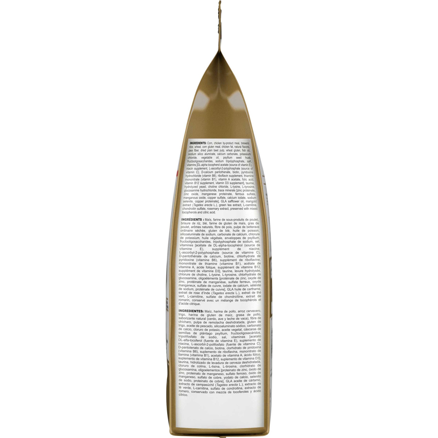 Corn, chicken by-product meal, brewers rice, wheat, corn gluten meal, chicken fat, natural flavours, pea fiber, dried plain beet pulp, wheat gluten, fish oil, grain distillers dried yeast, sodium silico aluminate, calcium carbonate, vegetable oil, psyllium seed husk, potassium chloride, salt, fructooligosaccharides (FOS), taurine, sodium tripolyphosphate, hydrolysed yeast, vitamins, choline chloride, L-lysine, L-tyrosine, glucosamine hydrochloride, trace minerals, marigold extract, tea, L-carnitine, chondroitin sulphate, rosemary extract, preserved with mixed tocopherols and citric acid.