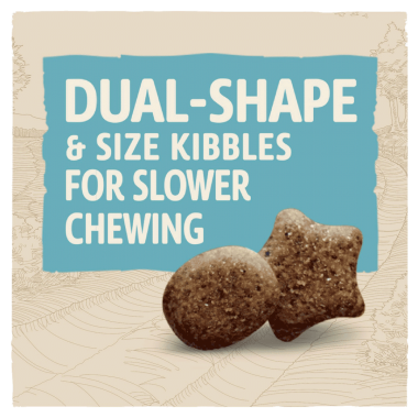 Dual-shaped kibbles help encourage chewing to mimic the effect of brushing and support dental health