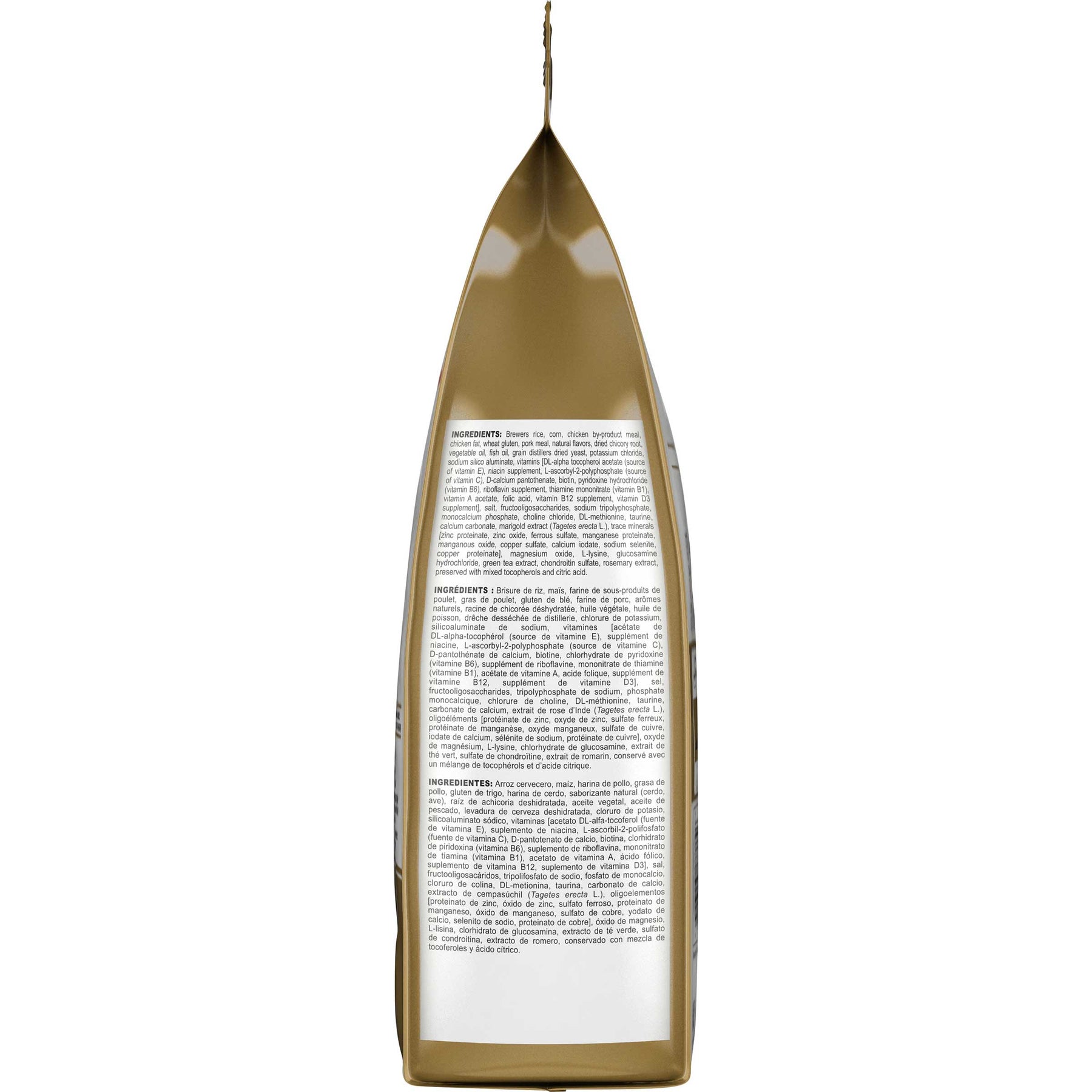 Maize, rice, dried poultry protein, animal fat, dried pork protein, hydrolysed animal protein, vegetable protein isolate, maize flour, chicory root, soya oil, minerals, fish oil, yeast, fructooligosaccharides, borage oil, marigold extract, grape seed and green tea extract, hydrolysate from crustaceans, hydrolysate from cartilage.